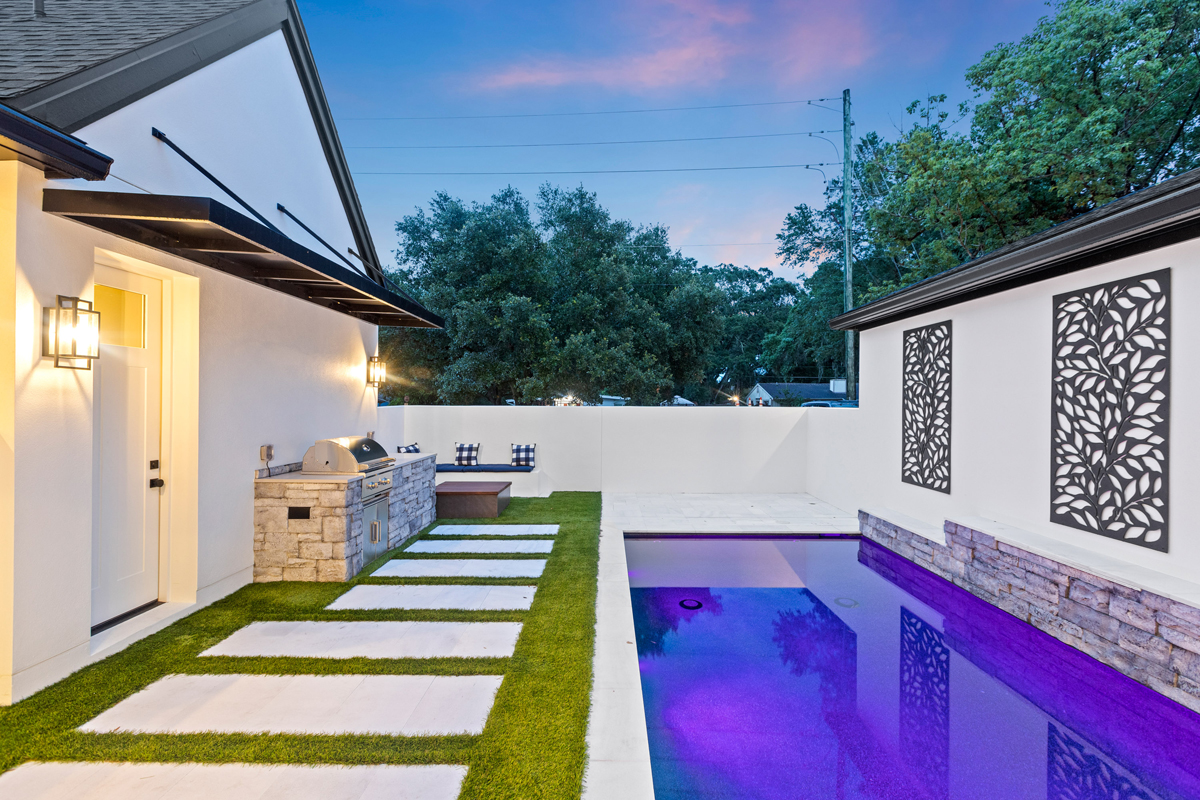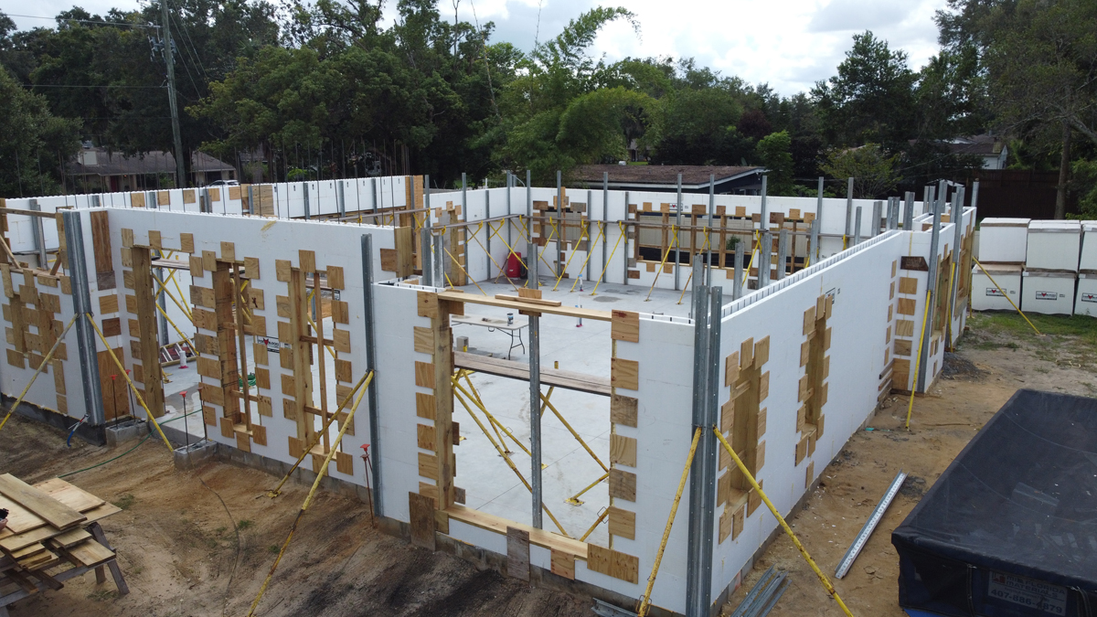 Mayura Manor in Winter Park, Florida, is a custom home built using Fox Blocks by Airlite Plastics Co. Completed in June 2022, the home has 4,330 square feet of conditioned space along with a 280-square-foot swimming pool.
