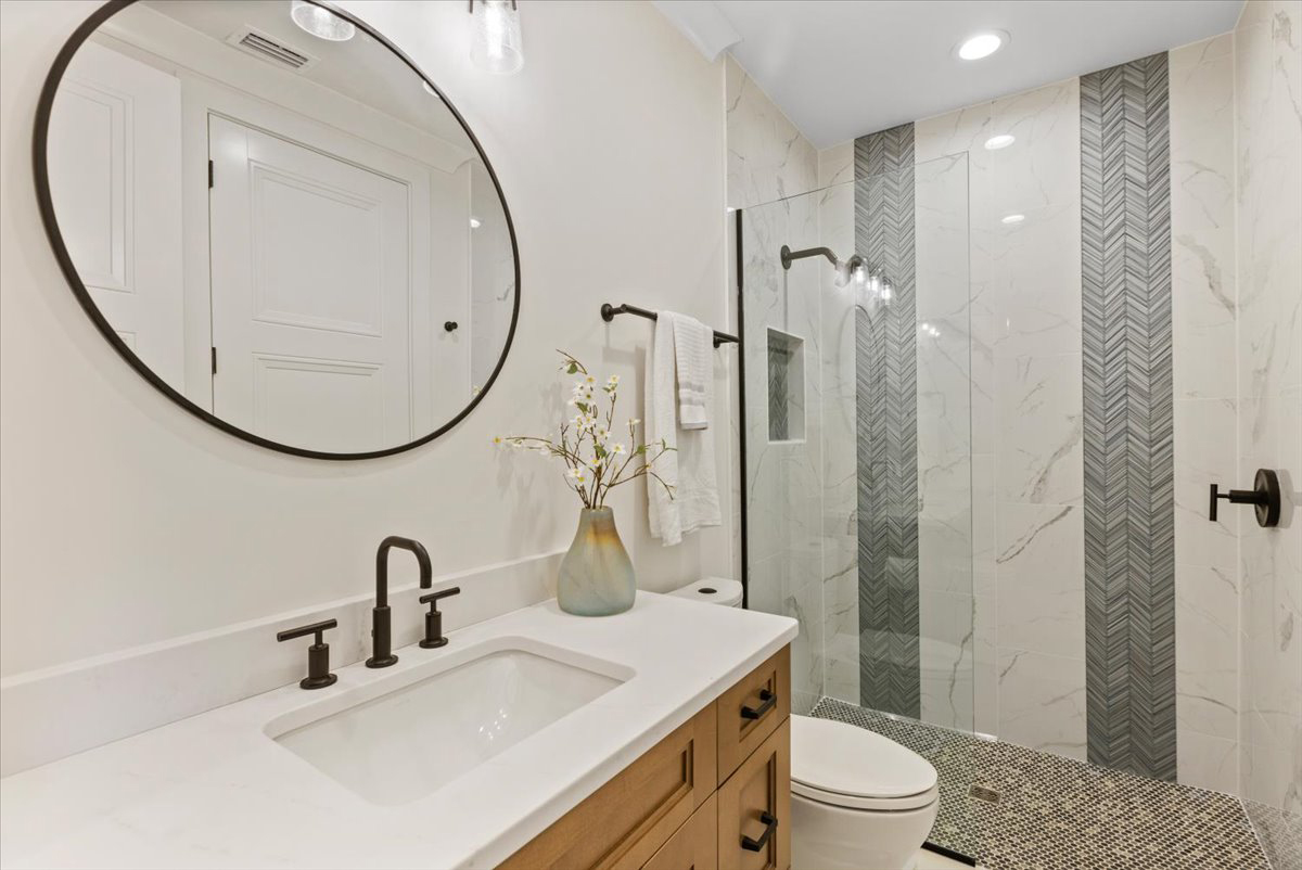 The complex design caused some other challenges as well. The design originally had eight corners. However, the city of Winter Park’s land-development code requires the length of side walls to have articulations, meaning they cannot have more than 30 feet of wall on a single plane. “In order to follow building codes, two bump-outs of 6 feet by 10 inches were built, creating a tight corner that blocked usage and demanded exact dimensioning to support a free-standing tub and window bench in each bump-out,” says Kennaw.