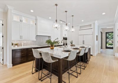 The front elevation is striking, including an elevated lot and a 35-foot top-of-roof height which contributes to a grand presence. The architect, Sirilla Design Group, included many front elevation architectural features that catch attention, including a 12:12 roof pitch with black shingles and metal roof accents at the dormers and covered porch.