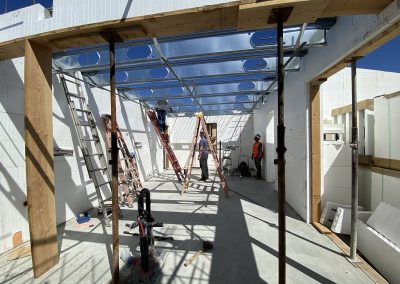 High-span steel joists were set against the walls as a rim, and different clipping and attachment systems were used to fasten the panels together and clip the roof onto the home,” says Kennaw.