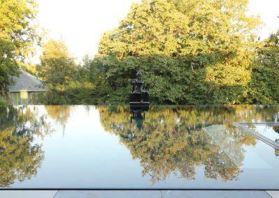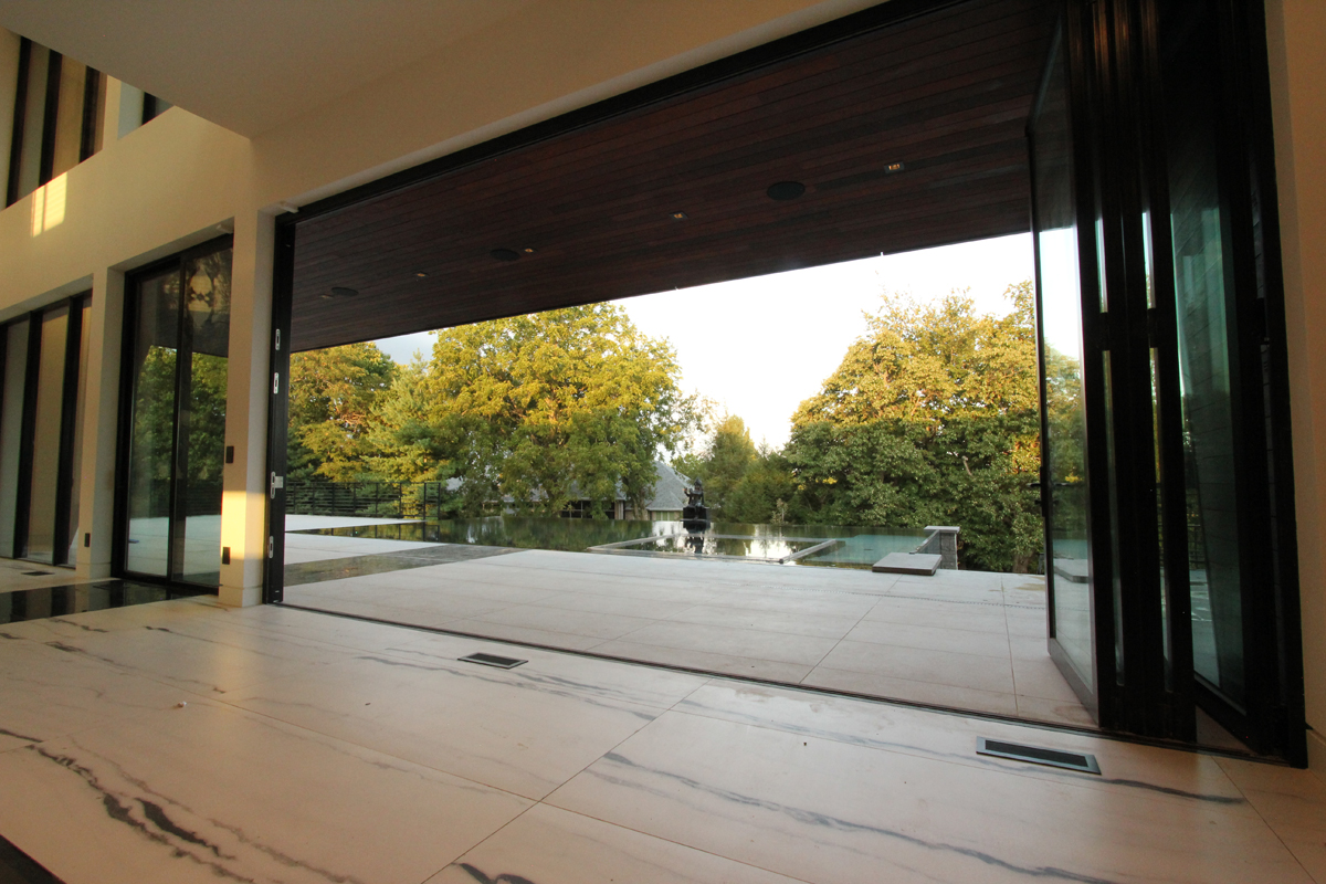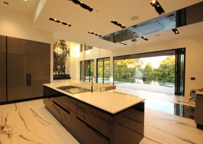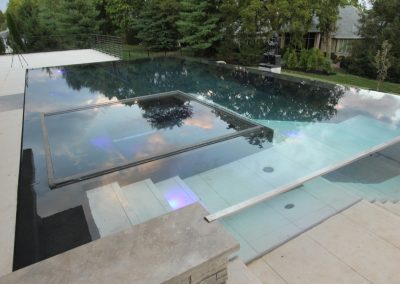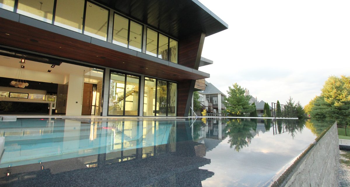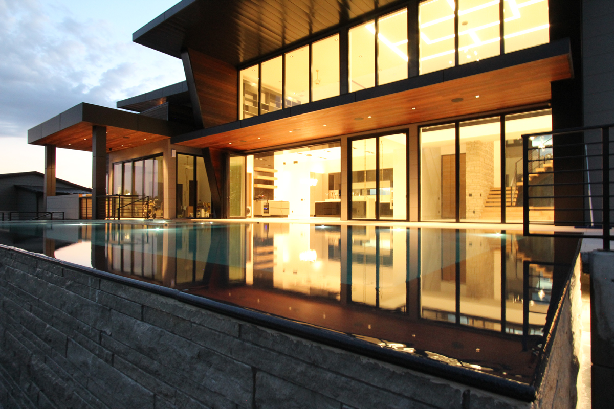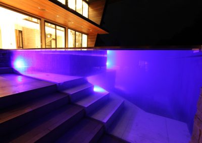 The pool is located behind the house, but the entire design is centered around the unique water features and 20-foot-tall multi-fold glass doors which lead to the main pool. The doors are artistically crafted to take on the appearance of a mirror throughout most hours of daylight. In line with the black inlay behind the pool is a statue which was placed at the perfect height, giving the illusion that it is rising up from the mirrored surface of the pool. The acrylic wall that splits the staircase allows the colored LED lights to escape out from the end of the pool and create a beautiful light washing effect on the lower pool deck areas.