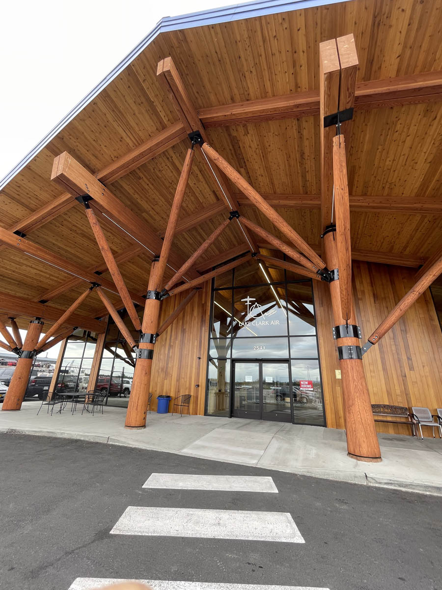 The lot occupied by Lake Clark Air at Merrill Field in Anchorage is narrow, and the hangar takes up most of the available width of the lot. Passenger aircraft are limited to the apron in front of the hangar to link the lobby space to aircraft parking. A canopy, similar to the entry, is routed along the east side of the building. This also allows passengers to exit the aircraft and go straight to the entry canopy without passing through the lobby space.