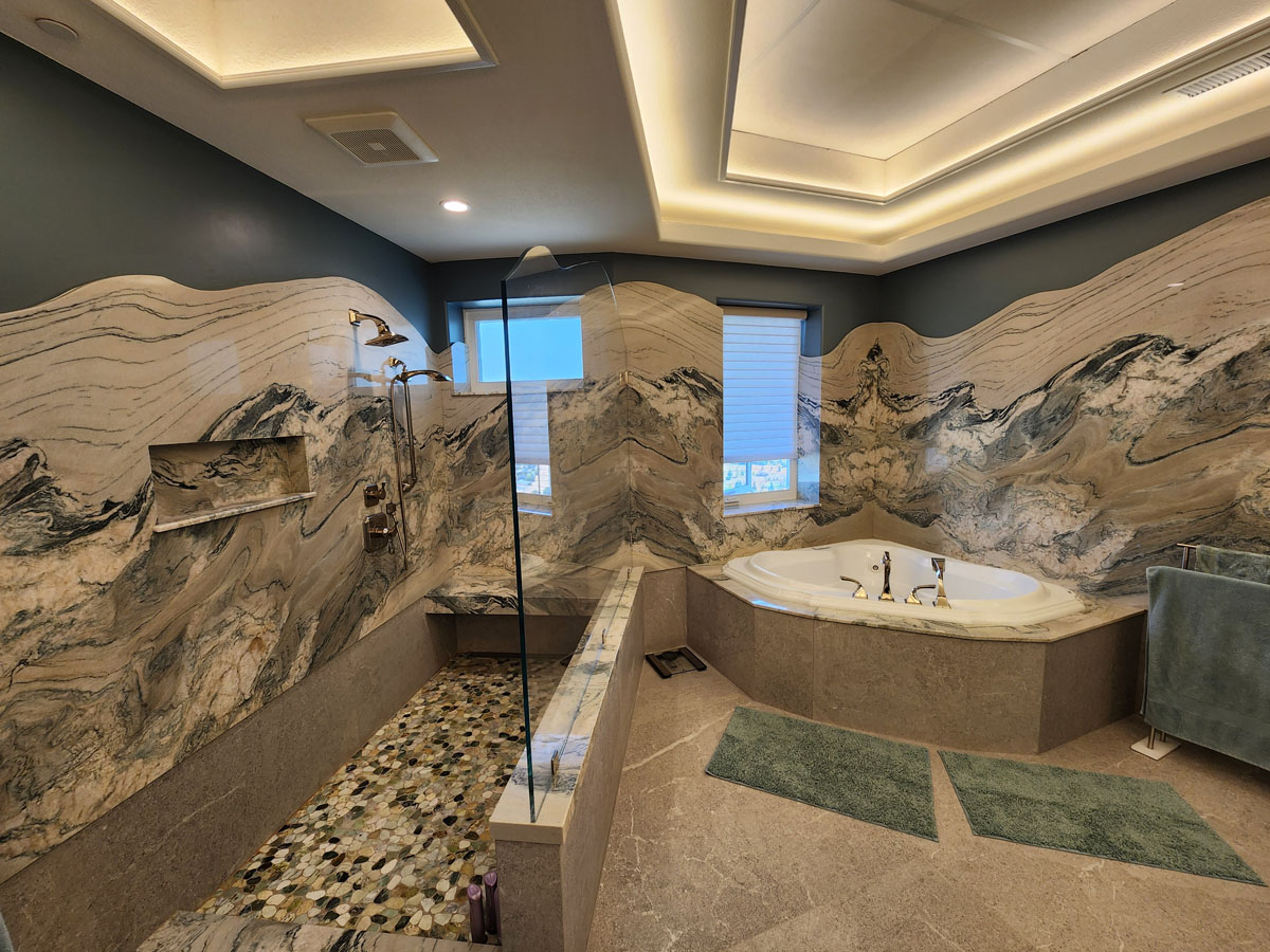 The Altamura Residence showcases numerous architectural highlights including a grand entrance staircase with curved concrete stairs, natural stone finish, and LED lighting. The guitar studio has a circular ICF, cantilevered, covered west-facing balcony and a custom wall-to-ceiling guitar cabinet made with velvet inlay and LED accent lights to house and display her custom guitars. The great room’s floor-to-ceiling windows reach 15 feet high, with bi-fold Nano doors that create a 14-foot wide indoor-outdoor connection to the deck.