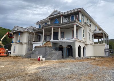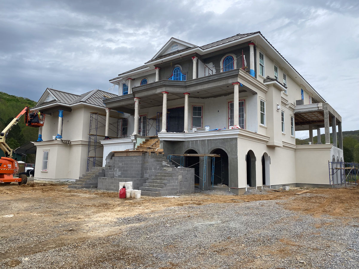 The curved formations required precise ICF forming techniques and careful attention to structural support during concrete placement. The project’s complexity extends beyond decorative elements to include cantilevered ICF walls over the garage and 20-foot wall structures requiring specialized support systems.